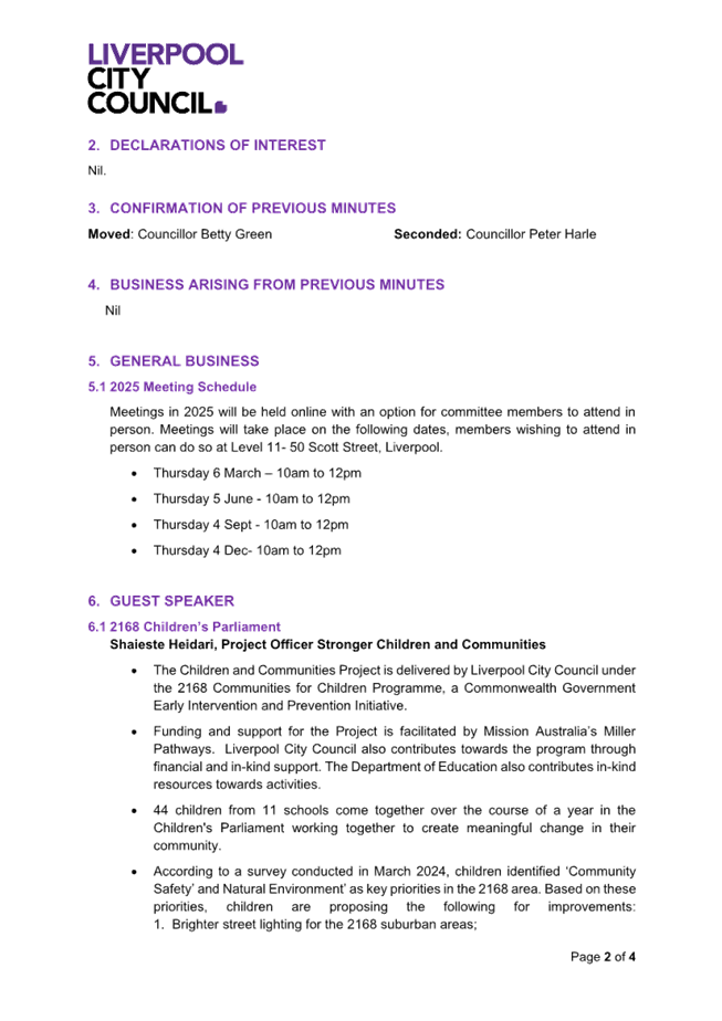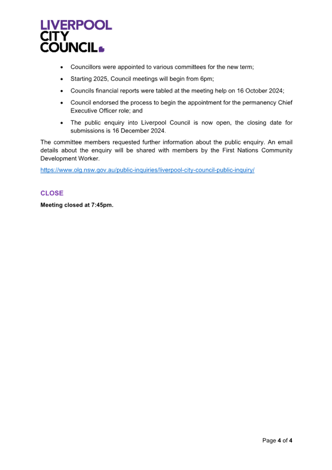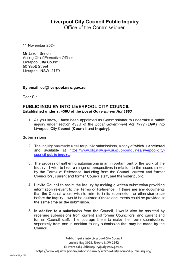 You are hereby notified that an Ordinary Council Meeting of Liverpool City Council will be held at the Liverpool Civic tower Council Chambers, Level 1, 50 Scott Street, Liverpool NSW 2170 on Tuesday, 10 December 2024 commencing at 2:00pm. Doors to the Chamber will open at 1.50pm.