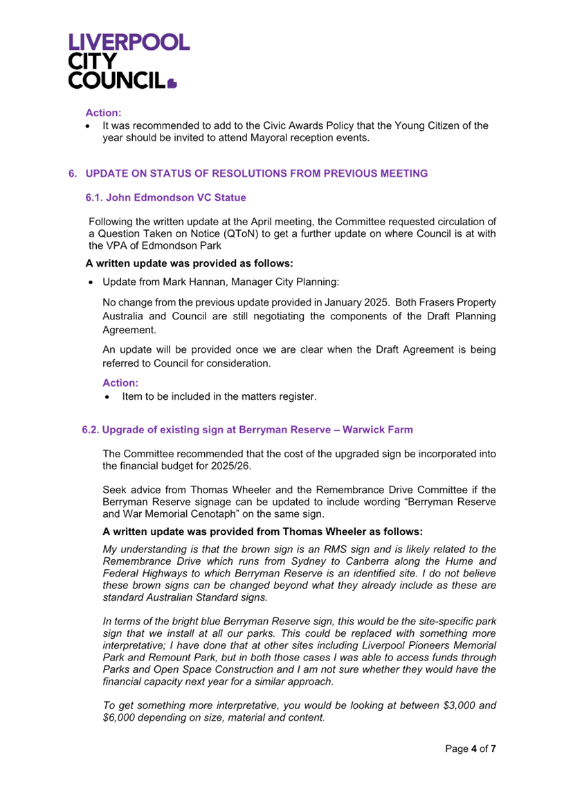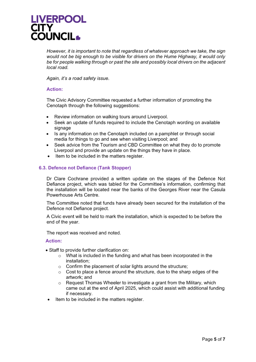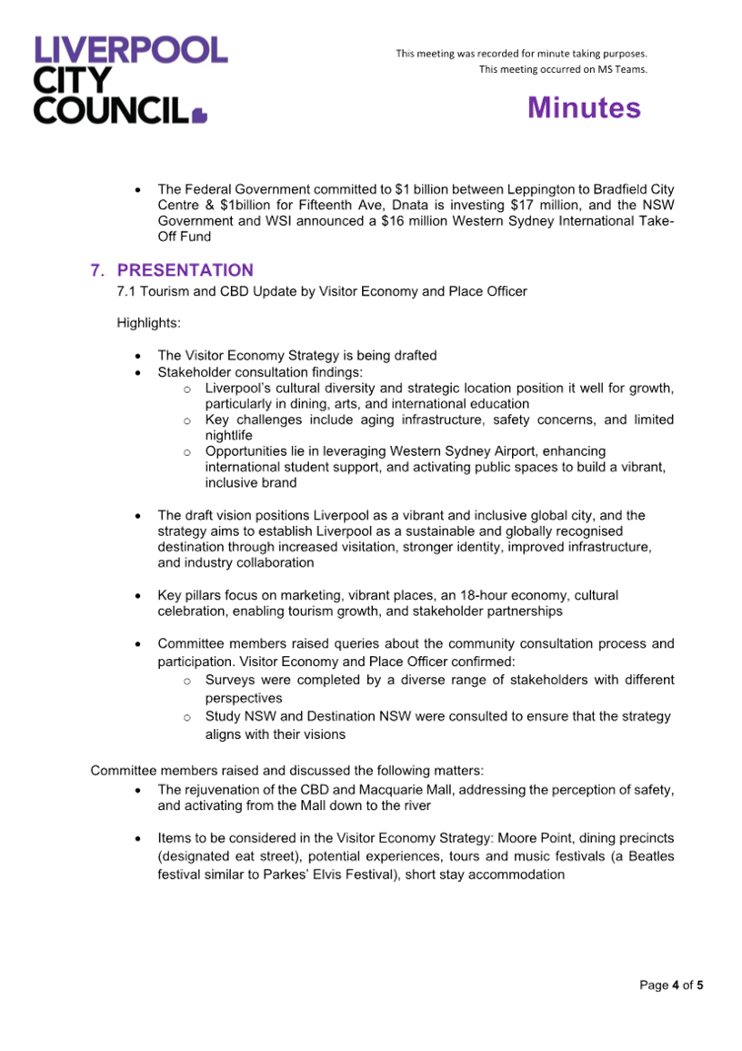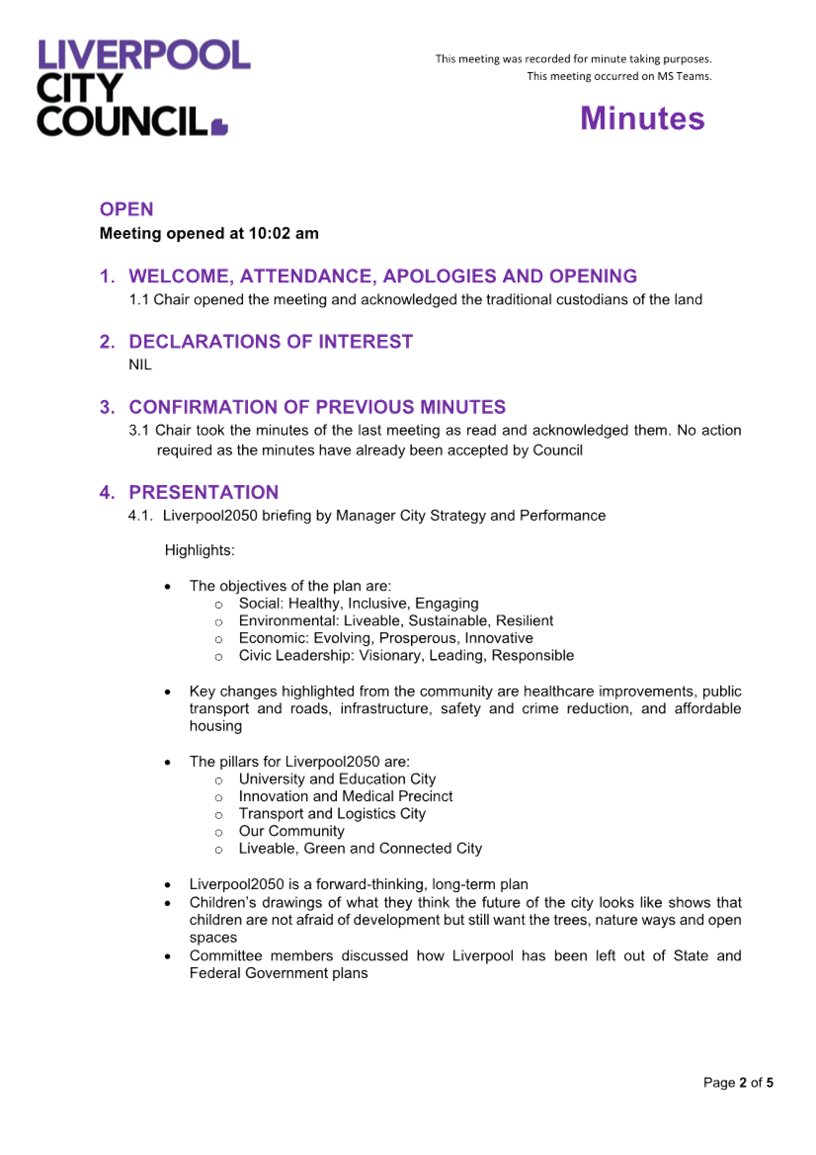 Liverpool City Council Meetings are livestreamed onto Council’s website and remain on Council’s website for a period of 12 months. If you have any enquiries, please contact Council and Executive Services on 8711 7863.
